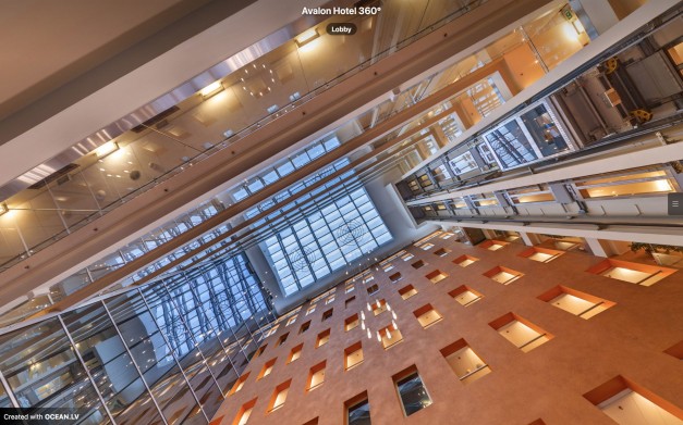 Pēc Avalon Hotel Riga pasūtījuma uzņēmām augstas izšķirtspējas 360° panorāmas attēlus un izveidojām individuāla dizaina virtuālu tūri dažādu tipu viesnīcas numuru, konferenču telpu, ēdināšanas zonas, bāra un citu publisko telpu prezentācijai 3D formātā. Virtuālā tūre apskatāma šeit – AVALON HOTEL 360°